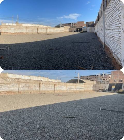 Está ubicado en la esquina de la calle Juan Buendia con 21.30 metros y la calle Vicente Ruso con  39.43 metros, tiene cerco, un área acondicionada para oficina con baño y también un lugar de vigilancia.